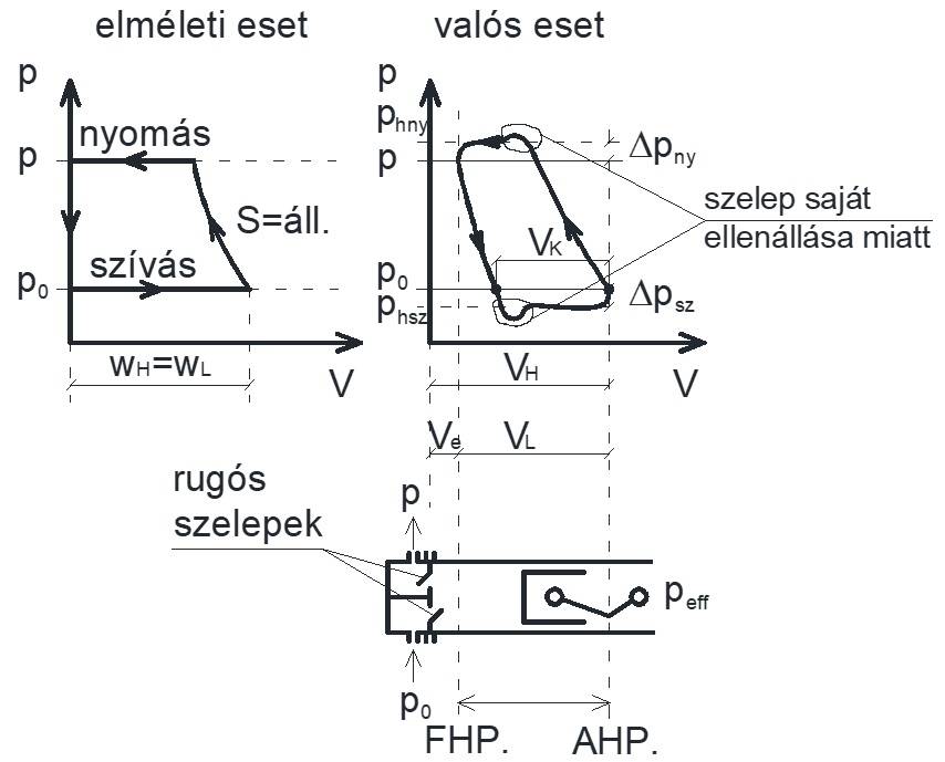 Ahhoz hogy a szívásnál belépjen a hűtőközeg a hengerbe, a hengerben lévő nyomás alacsonyabb kell, hogy legyen az elpárolgási nyomásnál. Ahhoz pedig, hogy kitolja, nagyobb kell, hogy legyen a nyomás a hengerben a kitoláskor, mint a kondenzációs nyomás. Ekkor nyílnak a szelepek a kompresszorban. Ahhoz azonban, hogy a szelep nyisson, még több munkát kell befektetni, hogy legyőzzük a szelep saját ellenállását szíváskor.