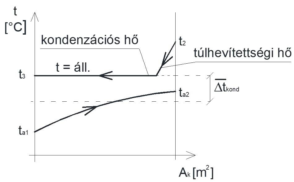 Az elején csökken a hűtőközeg hőmérséklete, leadja a túlhevítettségi hőjét, majd kondenzálódik. A túlhevítettségi hő a fázisváltozási hőhöz képest kicsi, így elhanyagoljuk a számításnál.