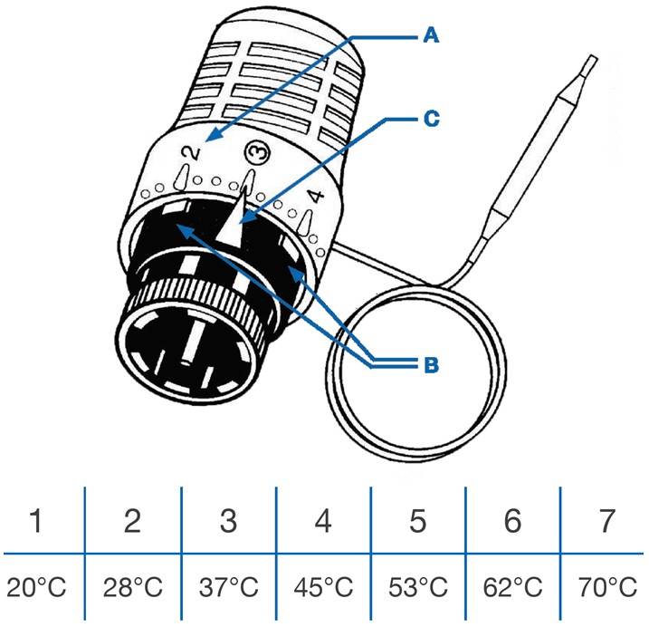 Ennek az igénynek a biztosítását a mai, korszerű szabályozási technológia a megfelelő tervezés hátterében lehetővé teszi. A PipeLife FT-RST/F padlófűtési szivattyús keverőegység alkalmazása esetén az előremenő hőmérséklet fokozatokban állítható 20 és 70 °C között. A termosztatikus fej 1-7-ig számozott skálával van ellátva (A). Az egyes fokozatokhoz tartozó hőmérsékletek a 4. ábra alatti táblázatból olvashatók ki.