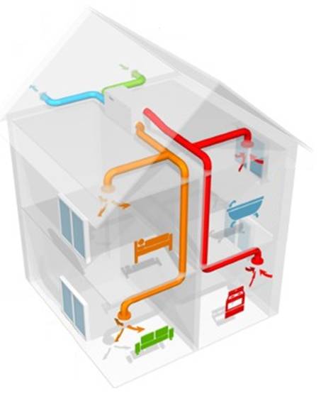 Ezzel szemben a központi hővisszanyerős szellőztetőrendszer folyamatos üzemben mindig a szükséges légcserét biztosítja a helyiségek számára (3. ábra). A hővisszanyerős szellőztetőberendezés befúvó- és elszívóventilátorának is van energiafogyasztása, azonban az csekély mértékű a hagyományos ablaknyitásos szellőztetés következtében történő felfűtés többlet-energiafelhasználásához képest.