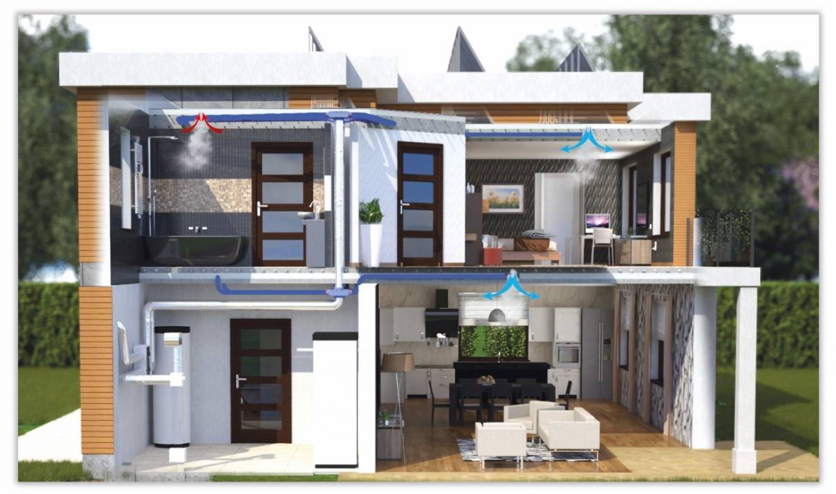 Mivel felújított épületekben megszűnik az ablakok hézagain és a tömítetlenségeken át kialakuló (természetes, de nagy hőveszteséggel járó) levegőcsere, az alacsony energiaigényű házban és az utólagosan hőszigetelt régi épületekben más módon kell gondoskodni a levegő szabályozott cseréjéről. Egy mesterséges központi hővisszanyerős szellőztetőberendezés (1. ábra) mentesíthet bennünket az alól a feladat alól, hogy ebből a célból rendszeres időközökben kinyissuk és becsukjuk az ablakokat, nyílászárókat.